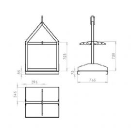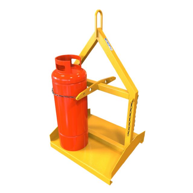 The crane slung gas bottle handler allow cylinders to be handled via a crane or overhead hook. The base is raised off the ground slightly to also allow for a forklift to lift, for positional purposes. Two retaining chains safely secure the gas bottles in place when in use.