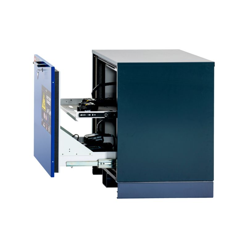Safe storage and charging of lithium-ion batteries with integrated alarm system.